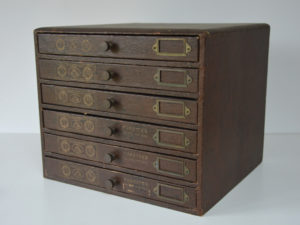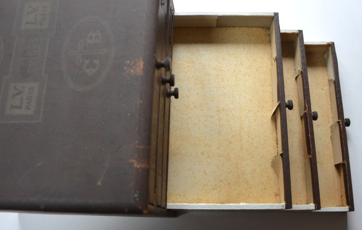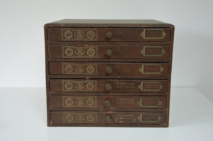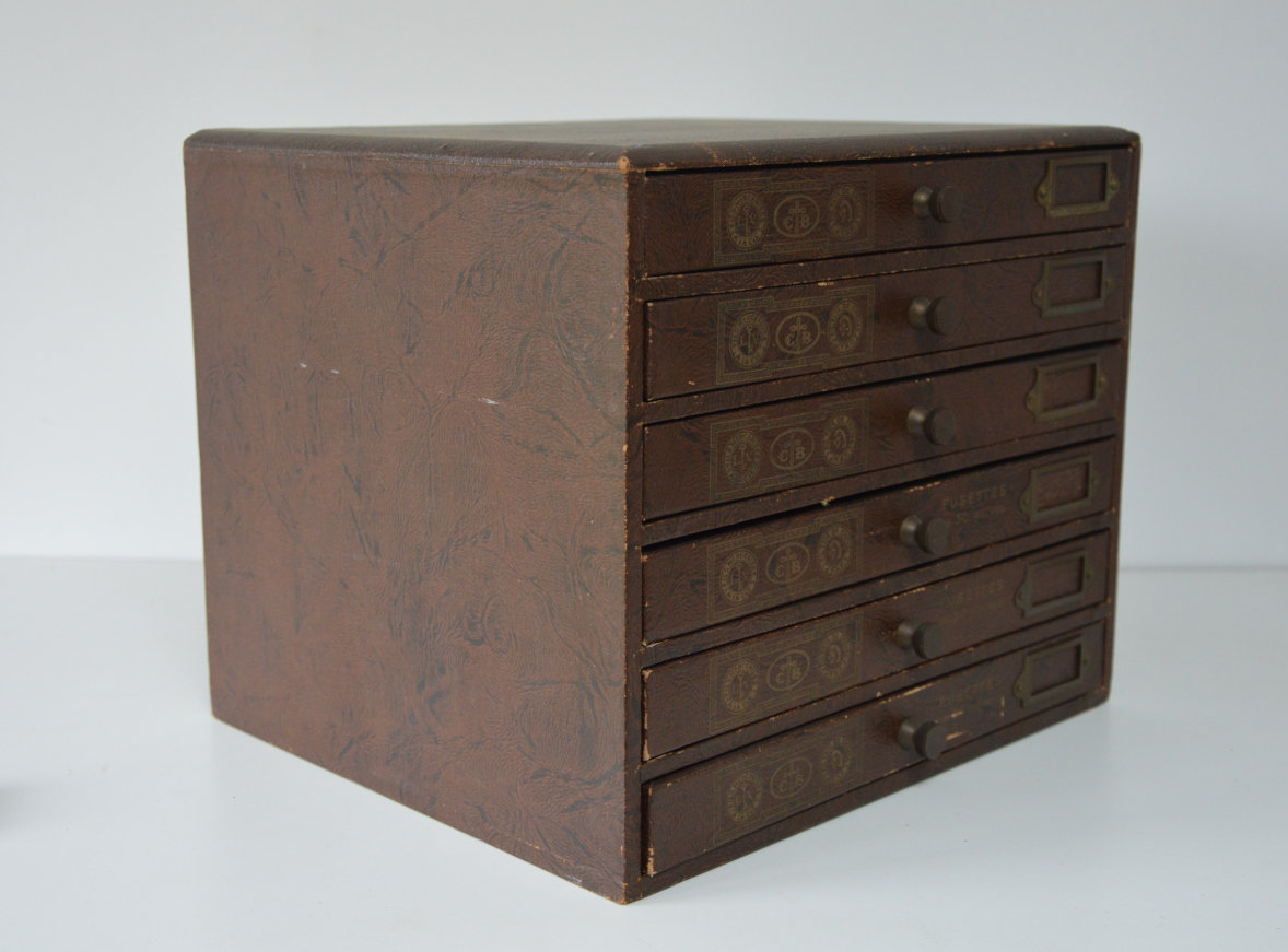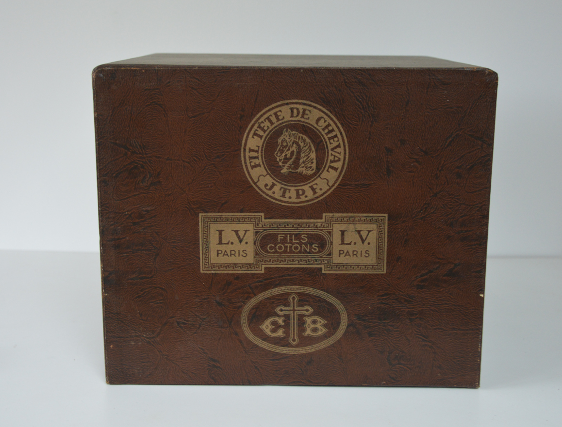Meuble à tiroirs de mercerie fils Cartier-Bresson LV Tête de cheval Ancien meuble à tiroirs de mercerie pour les fils Cartier-Bresson, JTPF tête de cheval, LV. Bon état, dans son jus, les intercalaires des tiroirs ont été supprimés. Format : 28 x 25,5 x 24 cm prix : 70 euros ref. 703/33