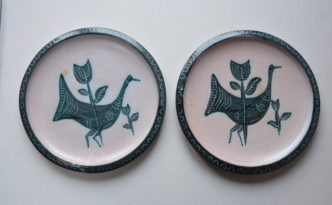 Lot de deux plats en céramique moderniste des années 1950. Décor à l’ oiseau et végétaux stylisés. Par Yvon Roy, atelier Montgolfier …