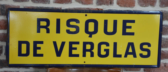 Ancien panneau de signalisation routière émaillé jaune, liseré et lettrage bleus. Format : 85 x 32 cm prix : 120 euros ref. 700/35