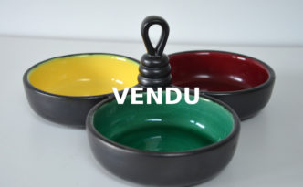 Centre de table / serviteur en céramique des années 1950 Faience de couleur noire, jaune, verte et rouge. Bon état Longueur : …