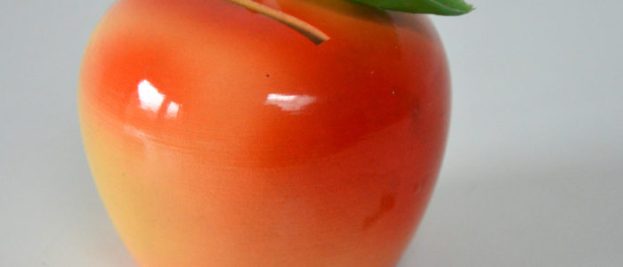 Ancienne tirelire en forme de pomme des années 1950/1960 En bois, feuilles en plastique. Bon état avec sa clé. « Made in France – modèle déposé » prix : 19 euros ref. 703/35