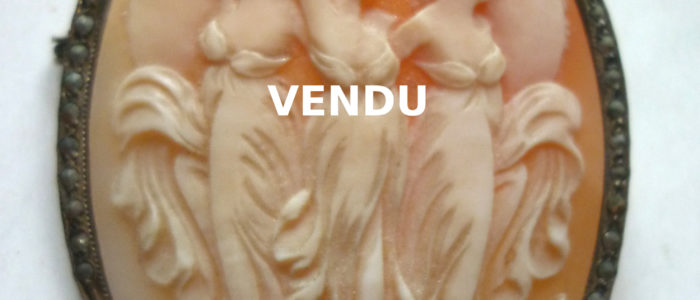 Très joli camée de grande taille représentant les 3 Moires, déesses du destin : Clotho, Lachésis et Atropos. Hauteur : 5 cm Monture en argent avec marcassites prix : Vendu ref. 699/19