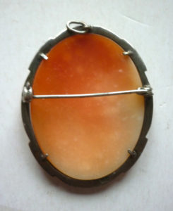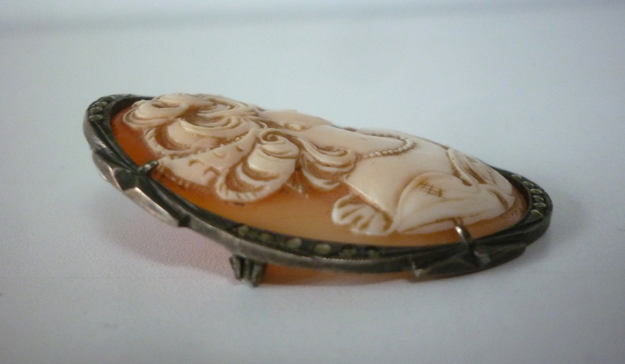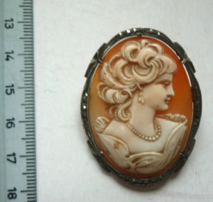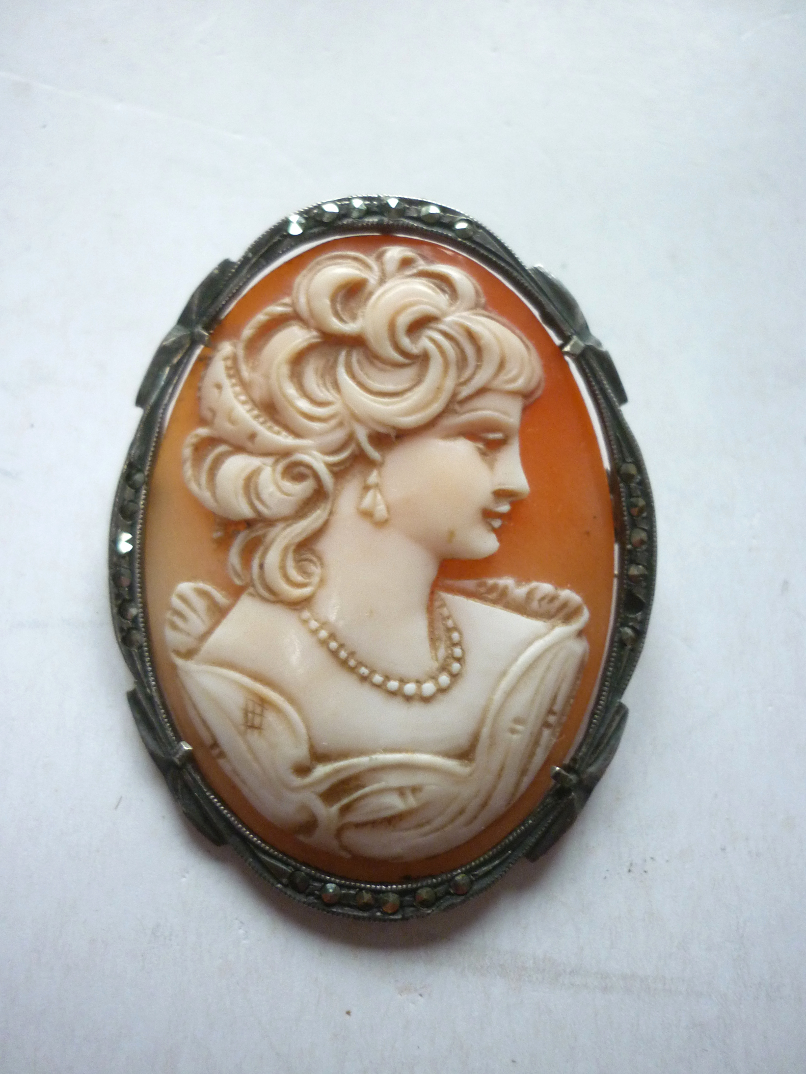 Ancien bijou : Camée monture argent profil de femme Joli camée de grande taille représentantun profil de femme Hauteur : 4,5 cm Monture en argent avec marcassites (1 manquante, peu visible) prix : 69 euros ref. 699/20