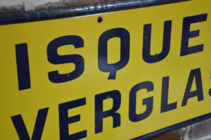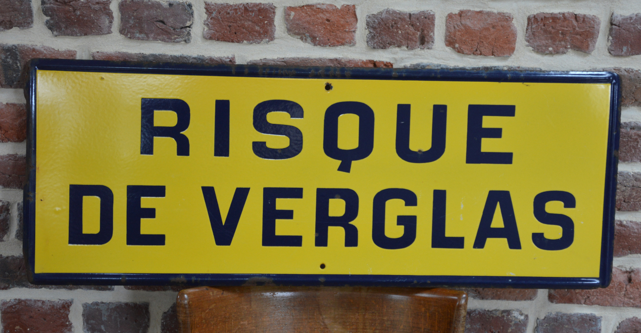 Ancienne plaque émaillée Risque de verglas Ancien panneau de signalisation routière émaillé jaune, liseré et lettrage bleus. Format : 85 x 32 cm prix : 120 euros ref. 700/35