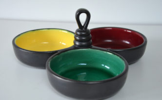Centre de table / serviteur en céramique des années 1950 Faience de couleur noire, jaune, verte et rouge. Bon état Longueur : …