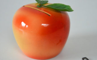 Ancienne tirelire en forme de pomme des années 1950/1960 En bois, feuilles en plastique. Bon état avec sa clé. « Made in France …