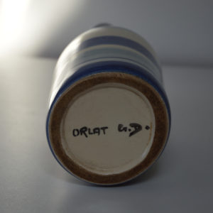 Gilbert et Denise Orlat créent leur atelier à Ébreuil (Allier) en 1953. Il est céramiste, élève de Pol Chambost ; elle est professeure de dessin à la Ville de Paris, élève de Jean Souverbie, professeur à l’école des Beaux-Arts de Paris.