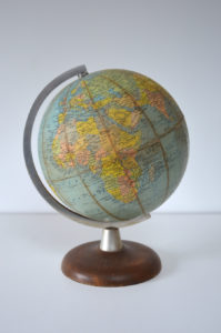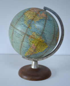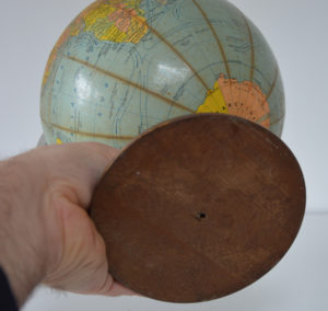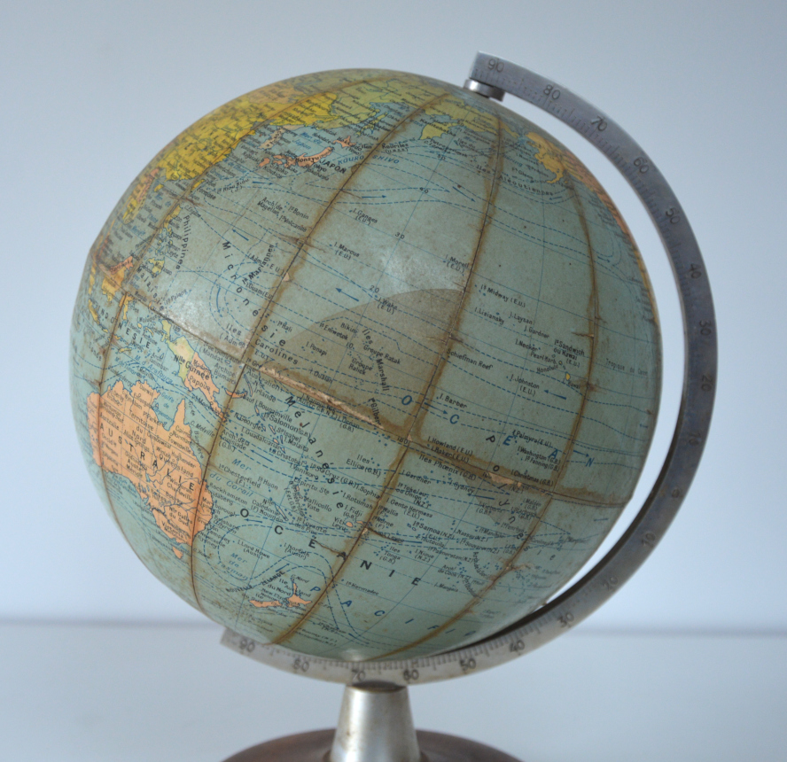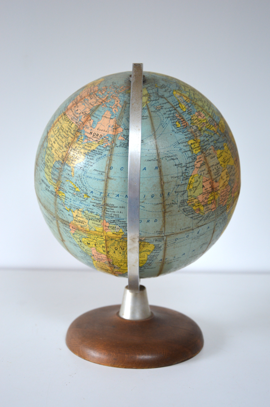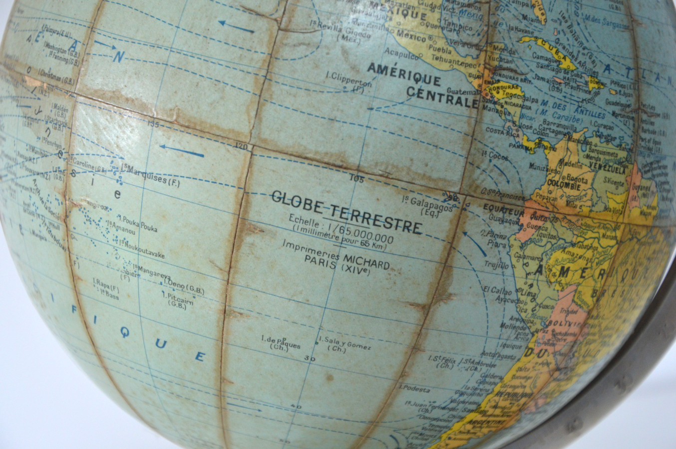 Globe terrestre Michard Ancien globe terrestre Michard Socle en bois, monture en aluminium, globe en carton recouvert de papier (traces du temps) Hauteur : environ 27 cm prix : 40 euros ref. 703/34